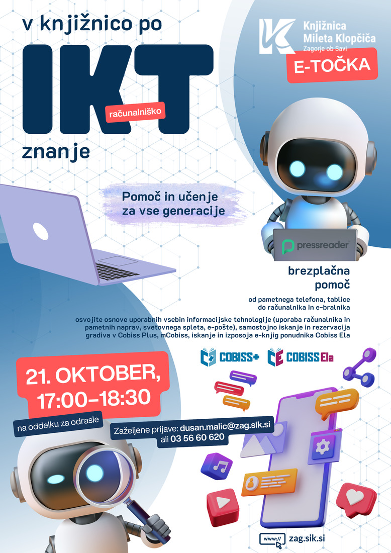 Vabimo vas na delavnico uporabe računalnika in pametnih telefonov, namenjeno vsem, ki želijo izboljšati svoje digitalne veščine ali se naučiti kaj novega. V današnjem svetu je računalniško znanje nepogrešljivo, saj tehnologija prežema vse vidike našega vsakdanjega življenja. Naša delavnica je primerna za vse starostne skupine in stopnje znanja. Pridružite se nam in naredite korak naprej v digitalnem svetu. Delavnica je brezplačna, prilagojena željam in predznanju udeležencem.