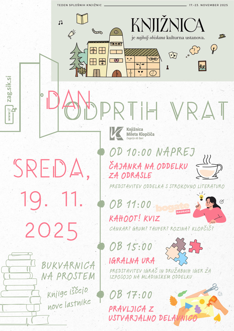Dragi ljubitelji knjig in kulture, vabimo vas, da se nam pridružite na Dnevu odprtih vrat Knjižnice Mileta Klopčiča Zagorje ob Savi, ki bo potekal v sredo, 19. novembra 2025, od 10. do 19. ure. Pripravili smo pester in zanimiv program za vse starosti, kjer boste lahko uživali v različnih aktivnostih in dogodkih.