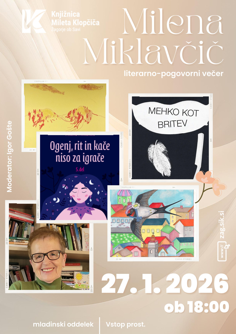 Knjižnica Zagorje vas vljudno vabi na literarno-pogovorni večer z Mileno Miklavčič, priznano pisateljico in pripovedovalko zgodb iz resničnega življenja. Dogodek bo potekal v torek, 27. januarja 2026, ob 18.00, na mladinskem oddelku. V pogovoru se bomo dotaknili avtoričinega ustvarjanja, življenjskih zgodb ter knjig Ogenj, rit in kače niso za igrače in Mehko kot britev, ki sta med bralci sprožili veliko zanimanja in razmisleka. Večer bo priložnost za poglobljen pogovor, izmenjavo mnenj ter srečanje z avtorico, ki s svojim delom odpira pomembna vprašanja o življenju, odnosih in družbi. Vstop je prost. Veselimo se vaše družbe.