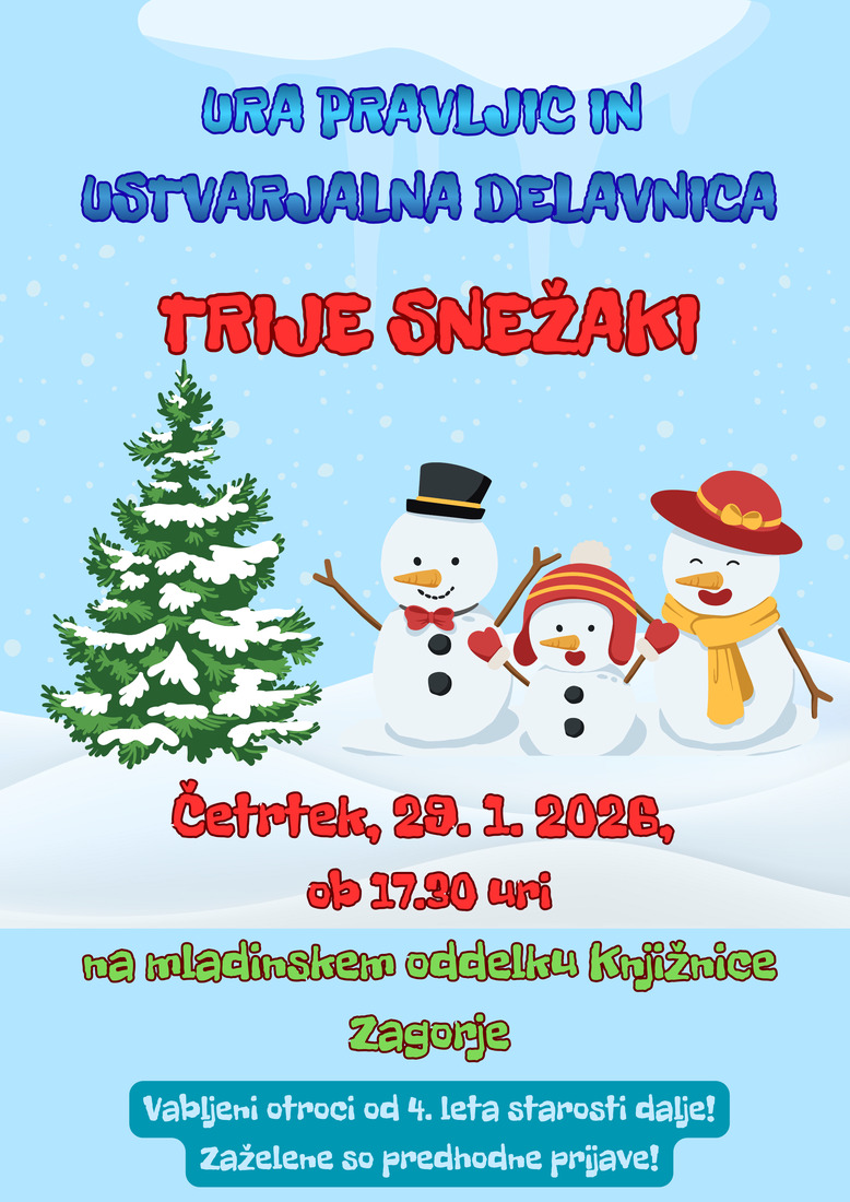 Vabimo vas na prijetno uro pravljic in ustvarjalno delavnico, kjer bomo skupaj prisluhnili zgodbi Trije snežaki ter se nato prepustili domišljiji in ustvarjanju. Zaradi lažje organizacije so zaželene predhodne prijave. Pridružite se nam na zimskem pravljičnem doživetju, polnem topline, smeha in ustvarjalnosti.