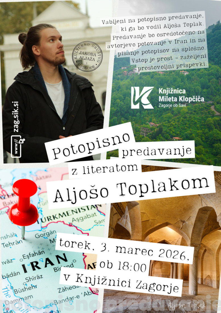 Vabljeni na potopisno predavanje, ki ga bo vodil Aljoša Toplak. Predavanje bo osredotočeno na avtorjevo potovanje v Iran in na pisanje potopisov na splošno. Aljoša Toplak piše članke za revijo Mentor in je izkušen na literarnem področju, saj to tudi študira. Vstop prost.