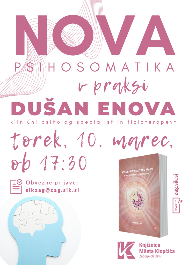 Klinični psiholog, fizioterapevt in duhovni iskalec Dušan Enova vas popelje na iskreno, pogumno in pretresljivo pot samozdravljenja. Na lastni koži je prepoznal pomen sinhronicitet, intuitivnega uvida, meditacije in energijskega dela kot ključev do telesnega, čustvenega in duhovnega zdravja. Nova psihosomatika ni alternativa medicini – je dopolnitev vaše človeškosti. Delavnica je brezplačna, a so zaradi omejenega števila mest obvezne predhodne prijave na e-poštni naslov: sikzag[at]zag.sik.si.