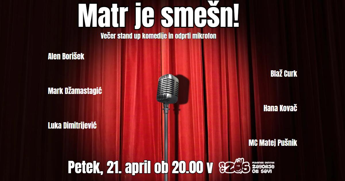 V petek, 21. aprila, ob 20.00 se nam bo na odru MC ZOS predstavilio nekaj že znanih in nekaj manj znanih slovenskih Stand up komikov. Alen Borišek, Blaž Curk ter Mark Džamastagić so na našem odru že nastopali, na novo pa se nam bosta predstavila še Hana Kovač in Luka Dimitrijević, MC pa bo tudi tokrat naš stalni gost, domačin Matej Pušnik.
